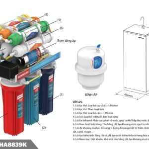 SHA8839K được trang bị van điện từ và hệ thống tự động kiểm soát hoạt động hiện đại cùng với công nghệ diệt khuẩn tiên tiến hàng đầu NANO SILVER và màng R.O nhập khẩu Hàn Quốc.