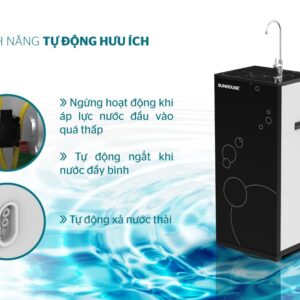 Máy lọc nước R.O SUNHOUSE SHA8839K được trang bị nhiều tính năng tự động hiện đại như: ngừng hoạt động khi áp lực nước đầu vào quá thấp, tự động ngắt khi nước đầy bình và tự động xả nước thải.