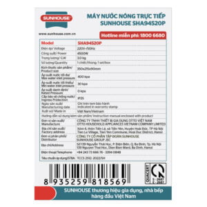 Thông số kỹ thuật Máy nước nóng trực tiếp Sunhouse 4500W SHA-9452OP